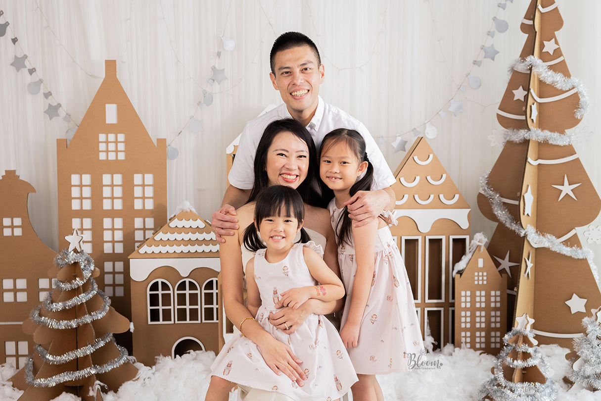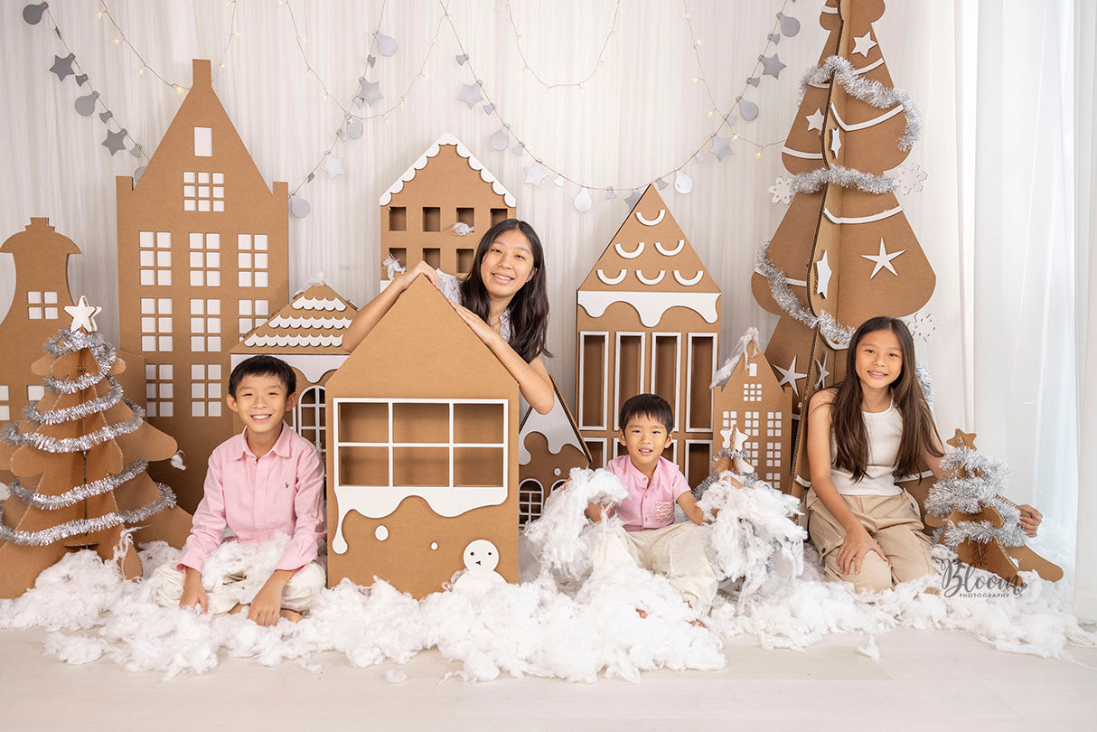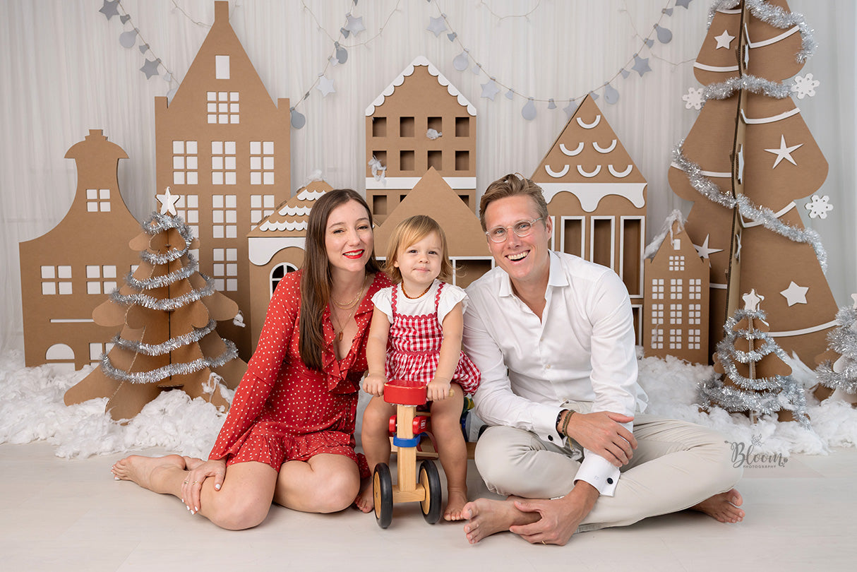 • A festive photoshoot experience featuring recyclable cardboard sets styled as a whimsical winter village.