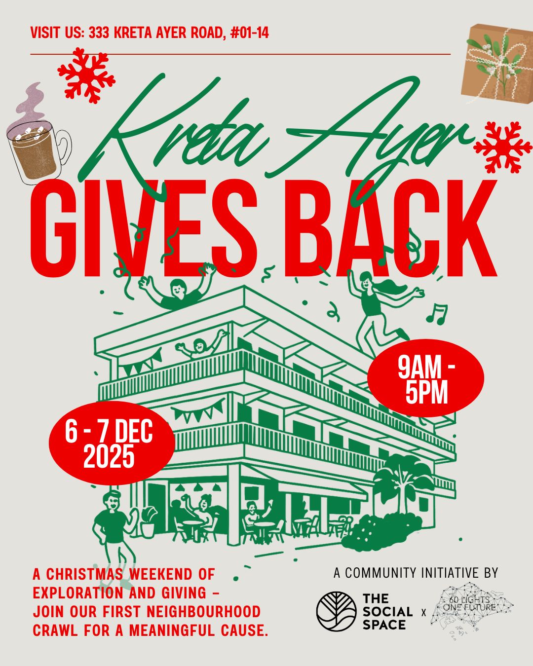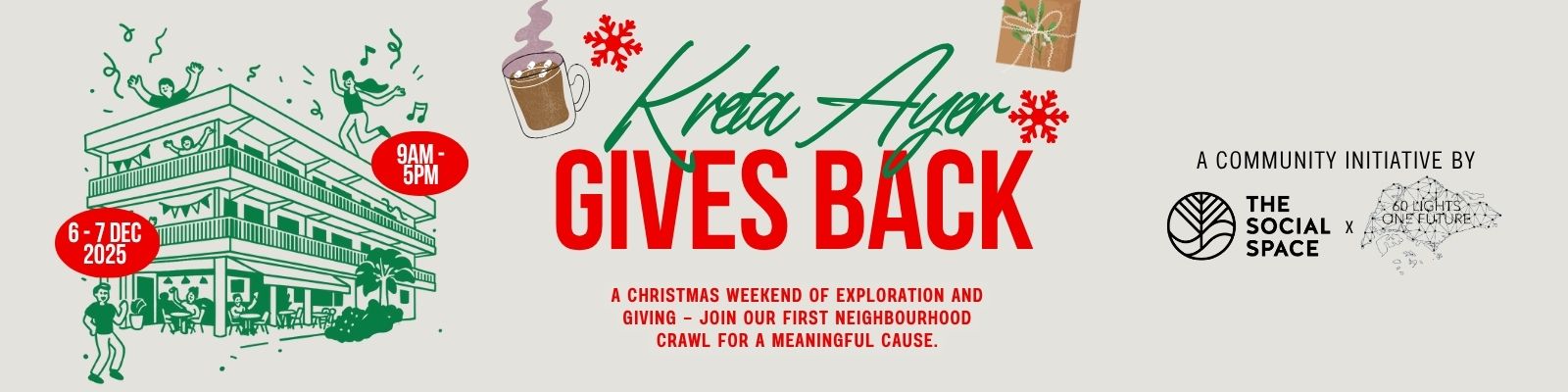 Our goal is to raise $6,000 through Kreta Ayer Gives Back — a festive neighbourhood campaign that unites local cafés, shops, and social enterprises to give back with heart.