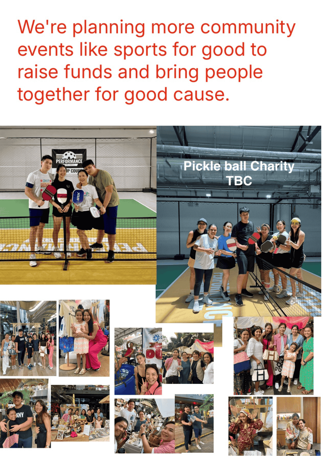 • Hosting community events like Sports for Good to raise funds and bring people together for a cause.